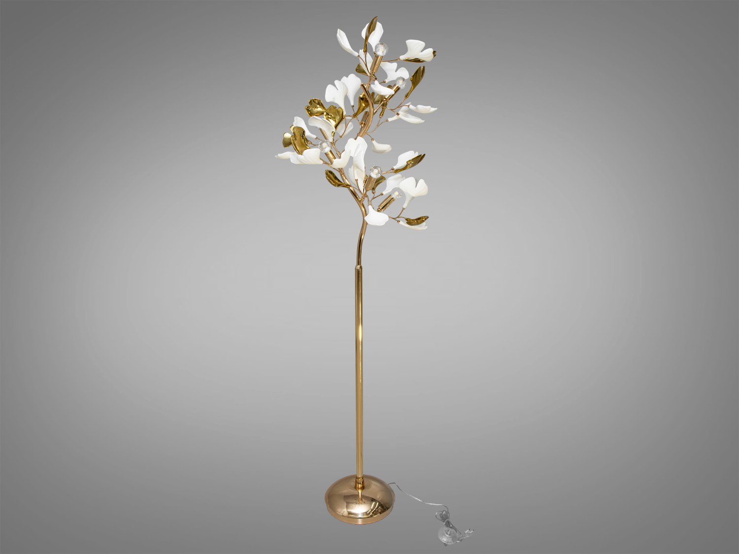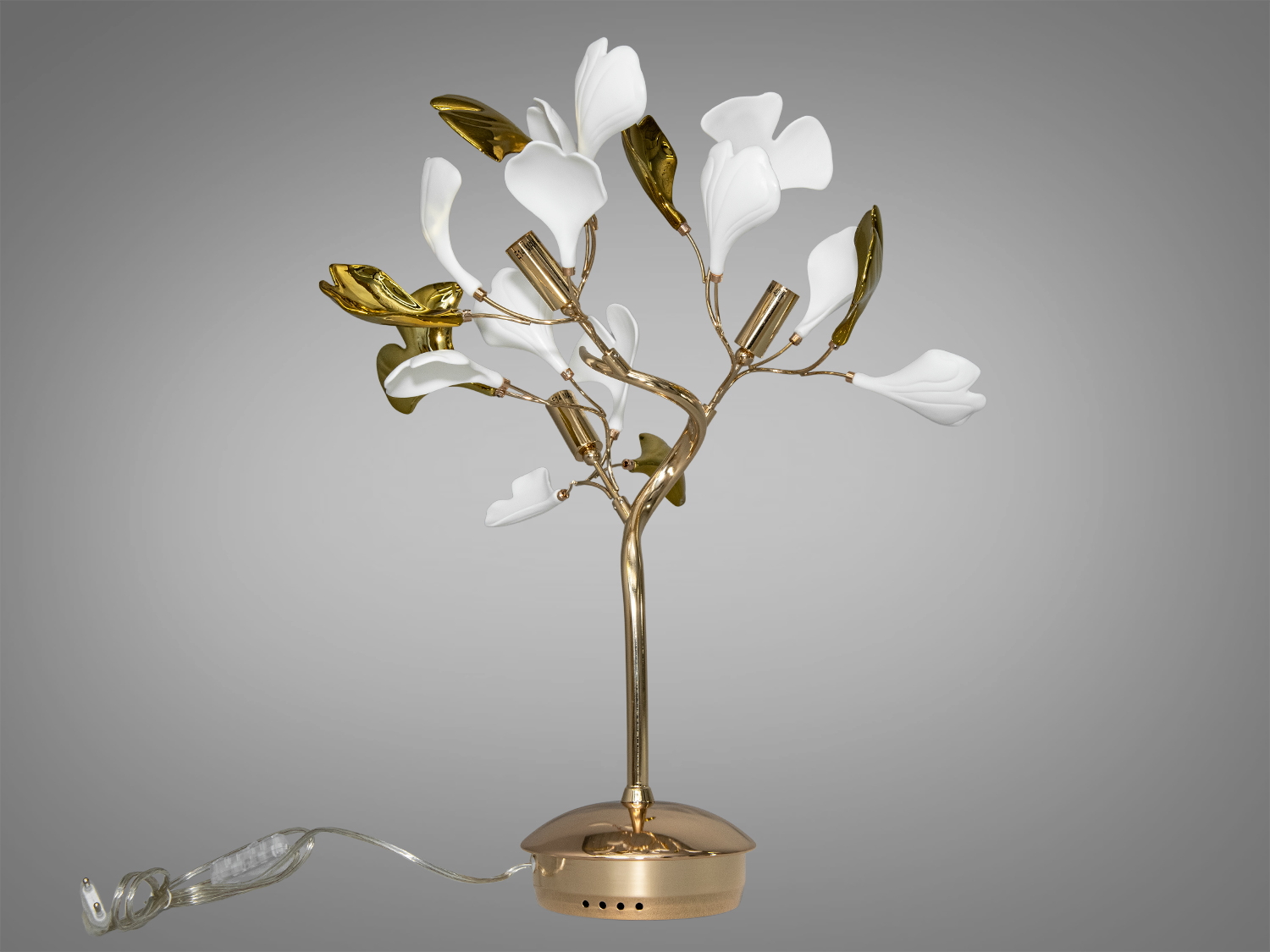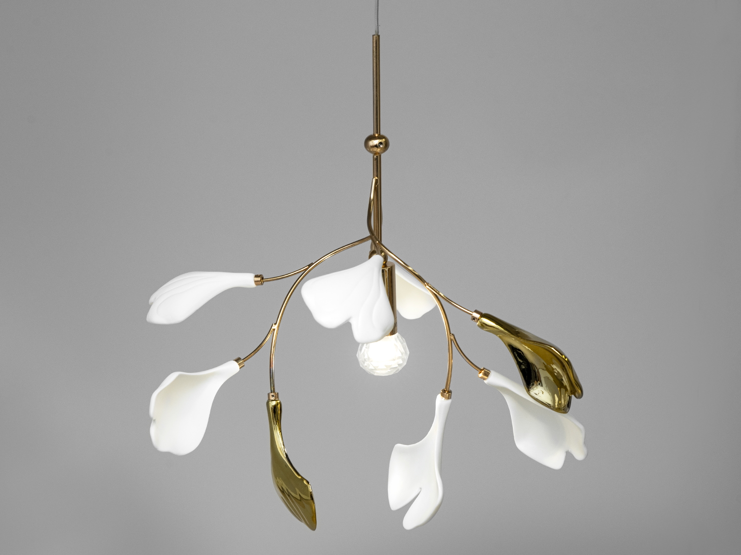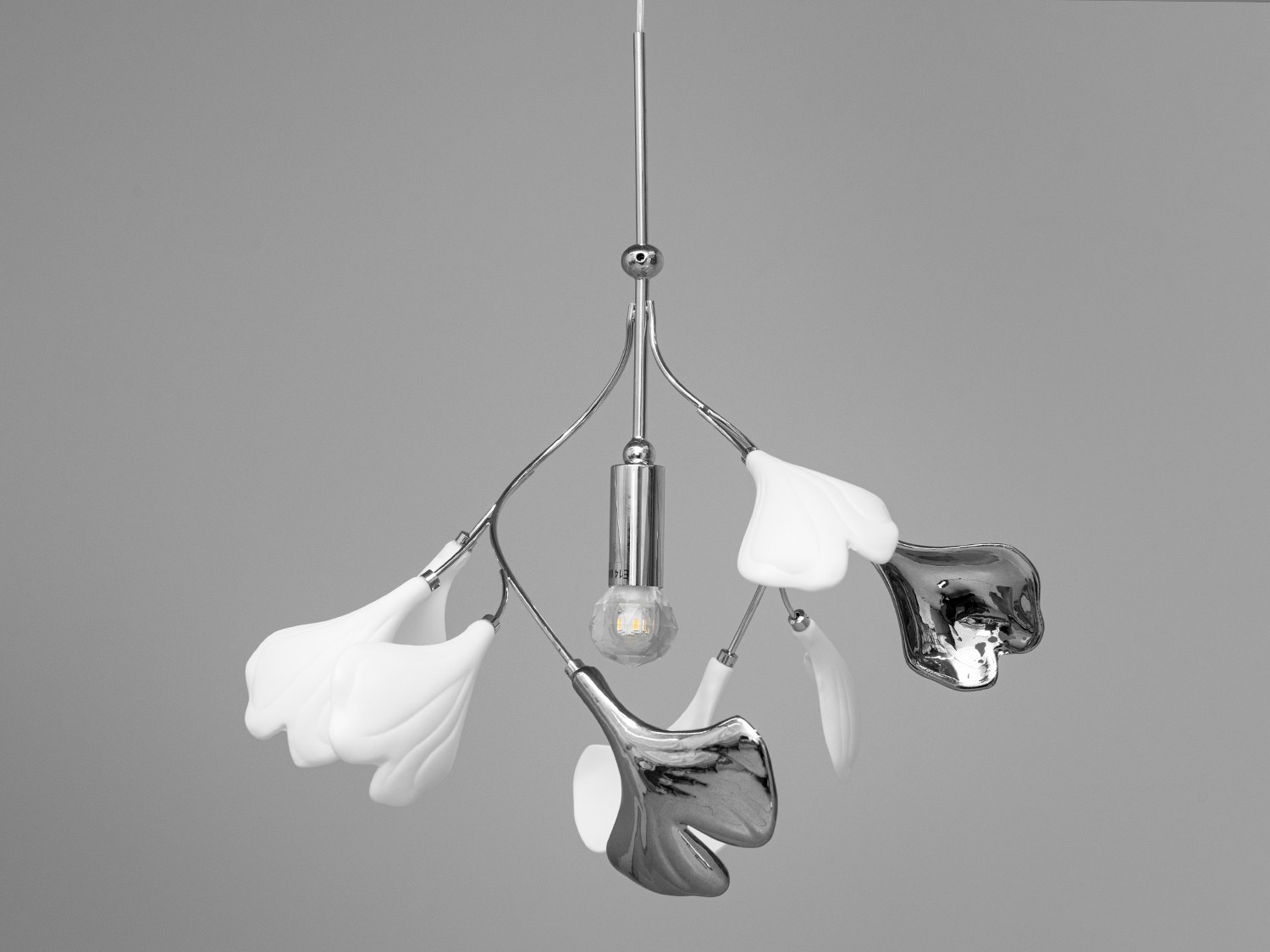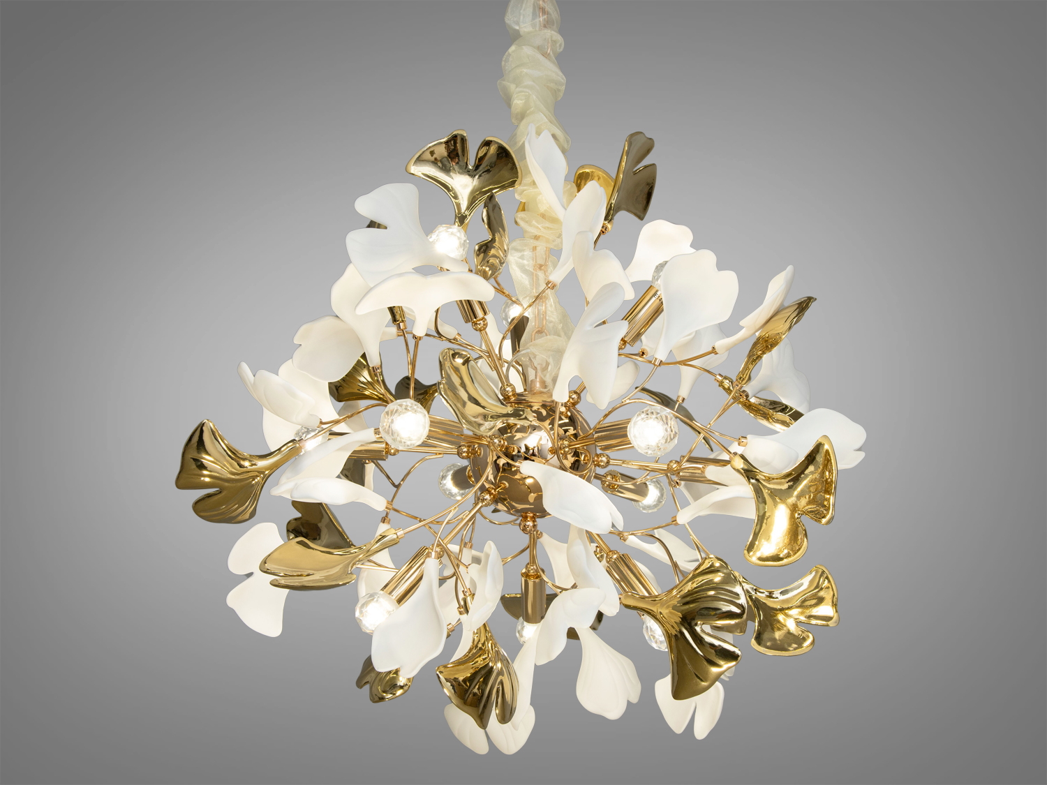 Серцем лампи є надійний металевий каркас з хромованим покриттям, який несе на собі керамічні елементи, що нагадують листя Гінкго Білоба, давній символ витривалості та сили природи. Неглазурований білий фарфор-бісквіт, з якого виготовлені пелюстки, має текстуру, що імітує мармур, додаючи лампі ауру класичної елегантності. Пелюстки, виконані в техніці глазурі під металік, варіюються від золотих до хромованих варіантів, що дозволяє їм вносити у дизайн нотки розкоші та блиску.