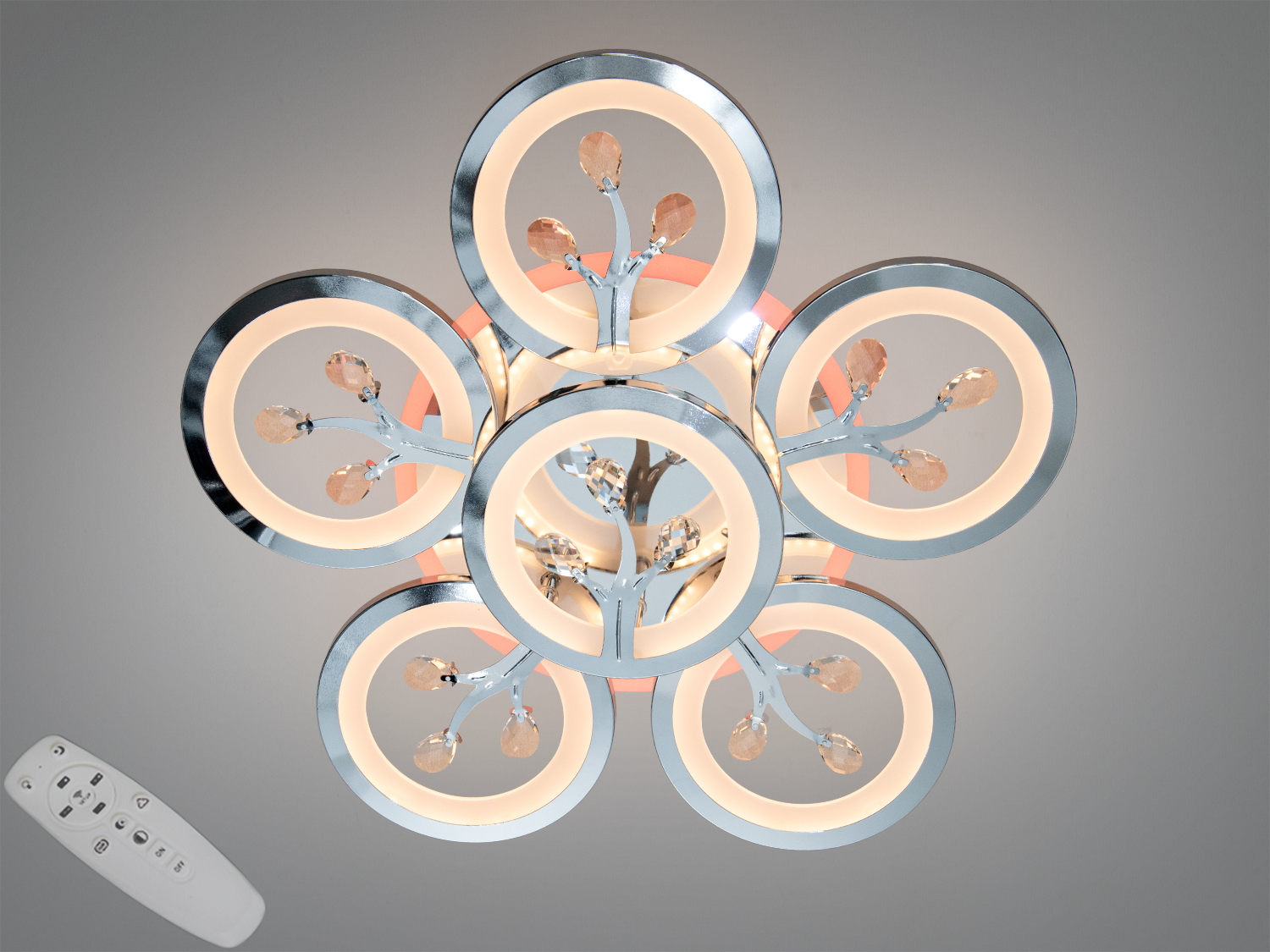 Люстра підтримує плавне регулювання яскравості за допомогою пульта. Передбачено три режими колірної температури: теплий 3200 К для відпочинку, нейтральний 4100 К для повсякденної активності та холодний 6500 К для зосередженої роботи чи прибирання. Підсвітка основи додає м’якого фоновго сяйва; її зазвичай використовують як декоративне або нічне світло. Керування можливе як пультом дистанційного керування, так і звичайним настінним вимикачем (послідовне перемикання режимів). Акуратний розподіл світла забезпечують акрилові дифузори, які згладжують тіні і допомагають отримати рівномірне загальне освітлення.