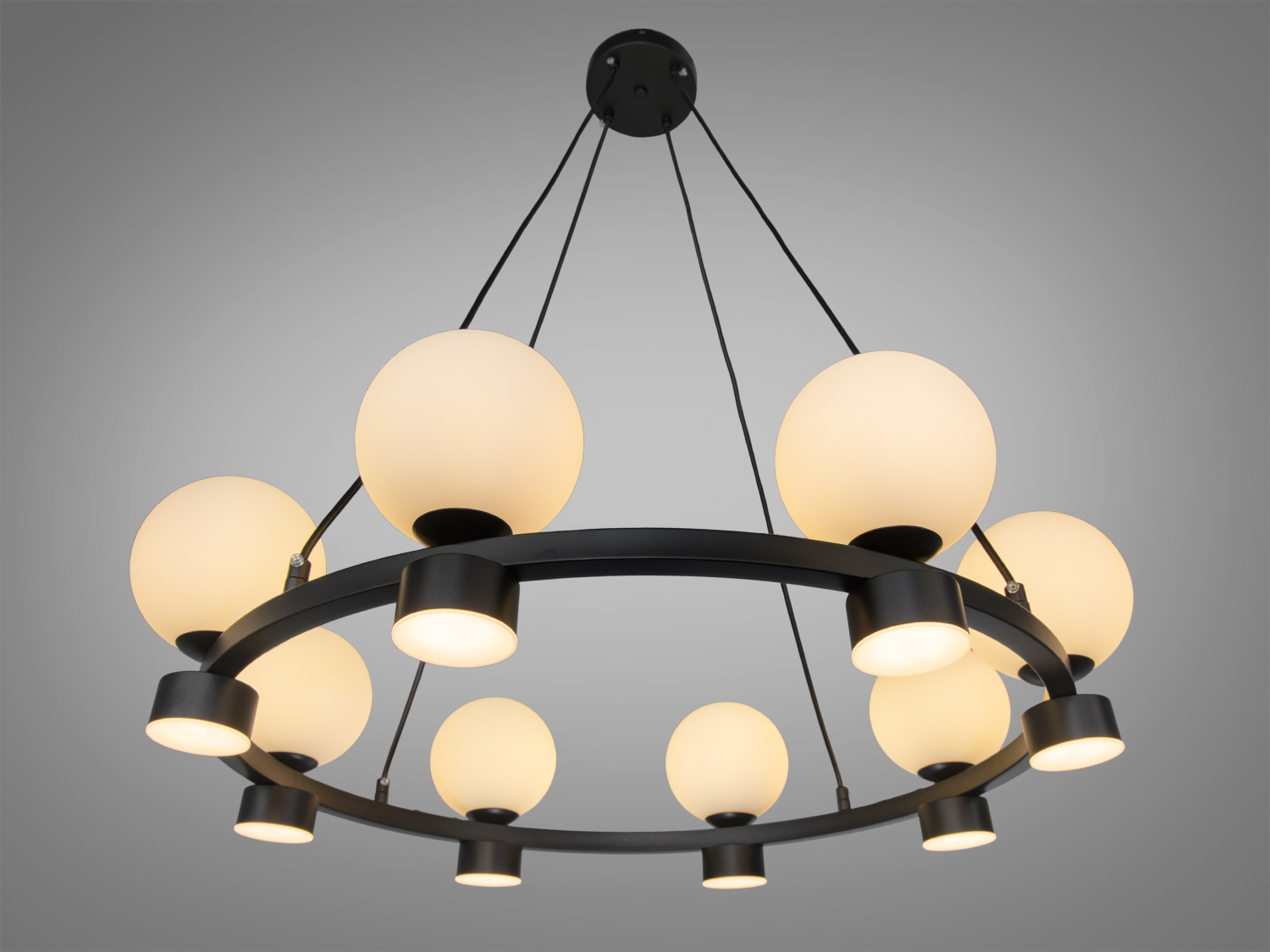 LQ7121-20BK — підвісна люстра на чорному металевому каркасі з білими матовими акриловими кулями. Модель поєднує два типи освітлення: верхній ярус з плафонами під лампи G9 та нижній ряд із LED-джерелами орієнтовною сумарною потужністю 40 Вт. Така схема допомагає отримати м’яке загальне освітлення і водночас підкреслити зони під люстрою. Конструкція виглядає лаконічно та доречно в інтер’єрах лофт, мінімалізм і сучасна класика.