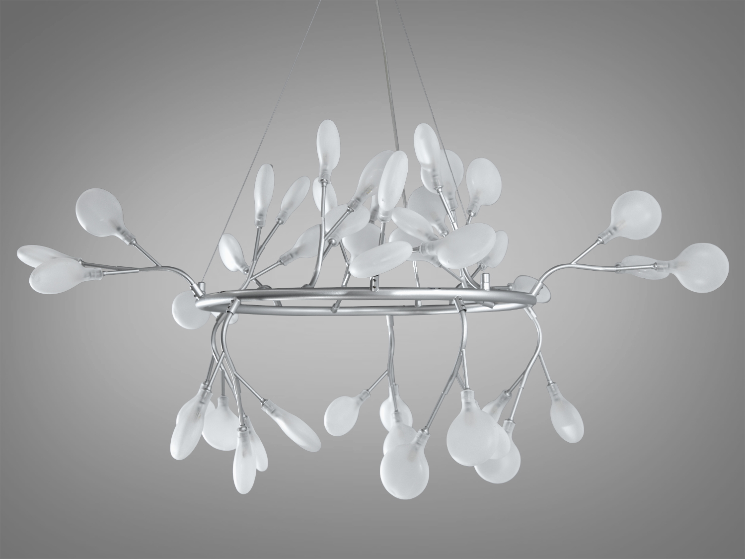 Розташування плафонів гілках які відходять від круглої трубчастої основи - це справжній шедевр дизайну. Вони прикріплені хаотично, створюючи ефектний і космічний вигляд. Ця хаотична асиметрія надає люстрі сучасний та еклектичний характер, але також має свою символіку. Вона нагадує про те, як маленькі "світлячки" розгортають своє світіння в нічному небі, створюючи гармонію хаосу та красу непередбачуваності.